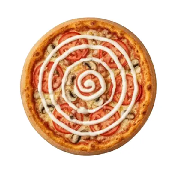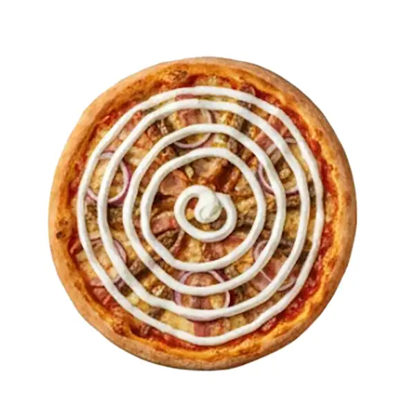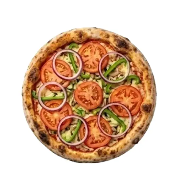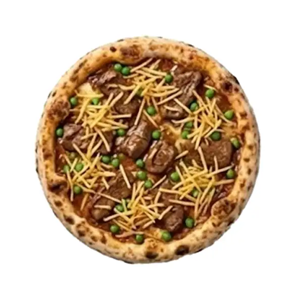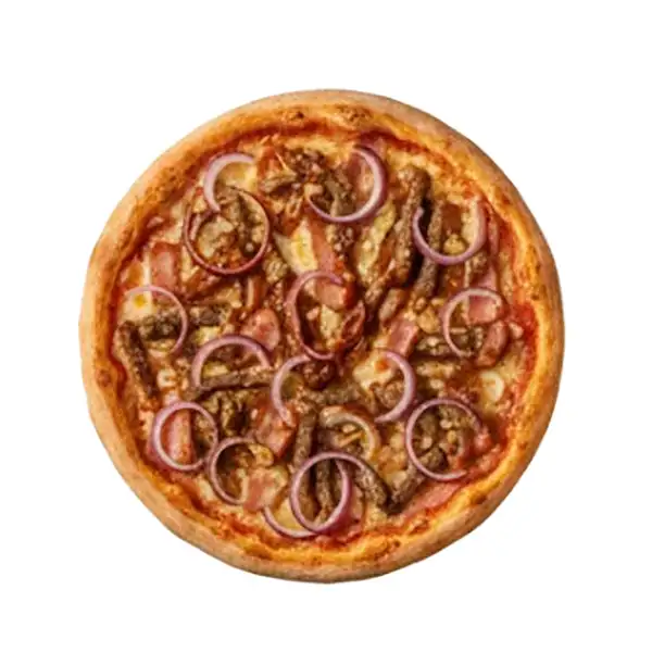 Queijo Mussarela, bacon, tomate, iscas de alcatra, pimentão, cebola