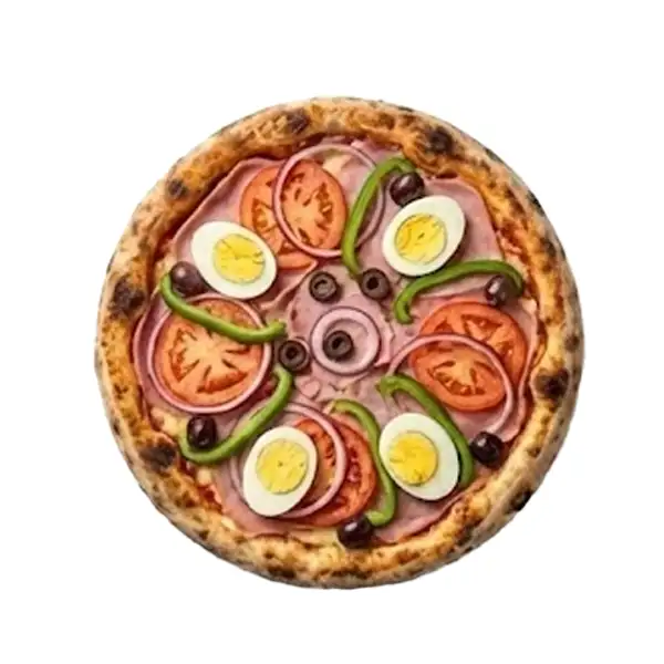Queijo mussarela, cebola, tomate, pimentão, azeitona, ovo