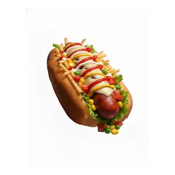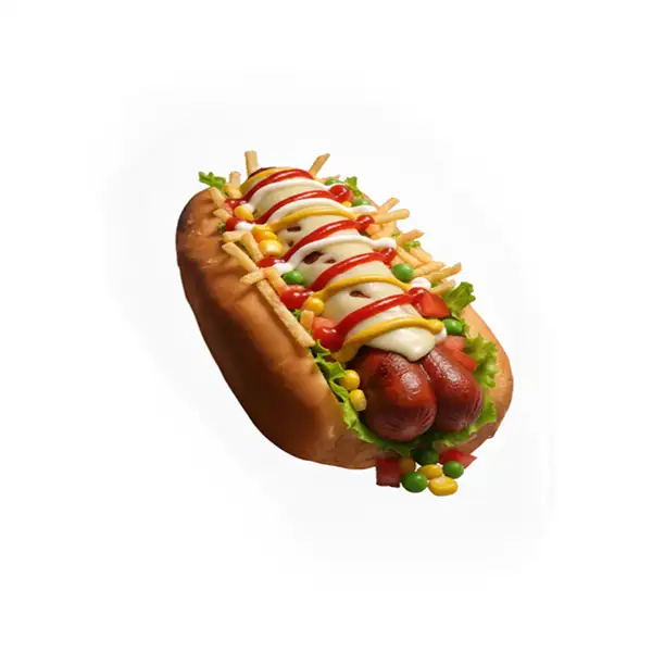 Linguiça Borrússia, queijo, milho, ervilha, maionese, batata palha, ketchup