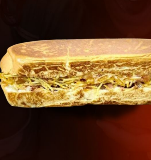 Strogonoff, ovo, queijo, alface, tomate, milho, ervilha e maionese.